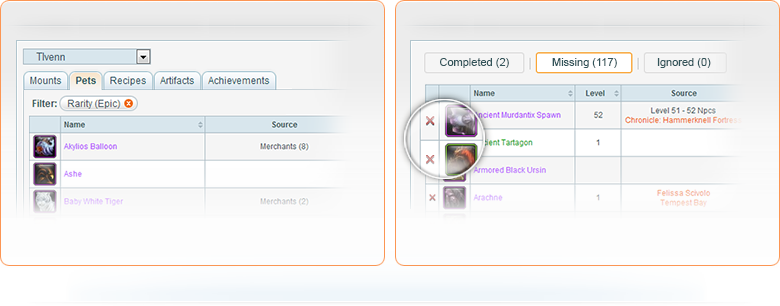 • Browse your mounts, pets, recipes, artifacts and achievements for each of your characters.